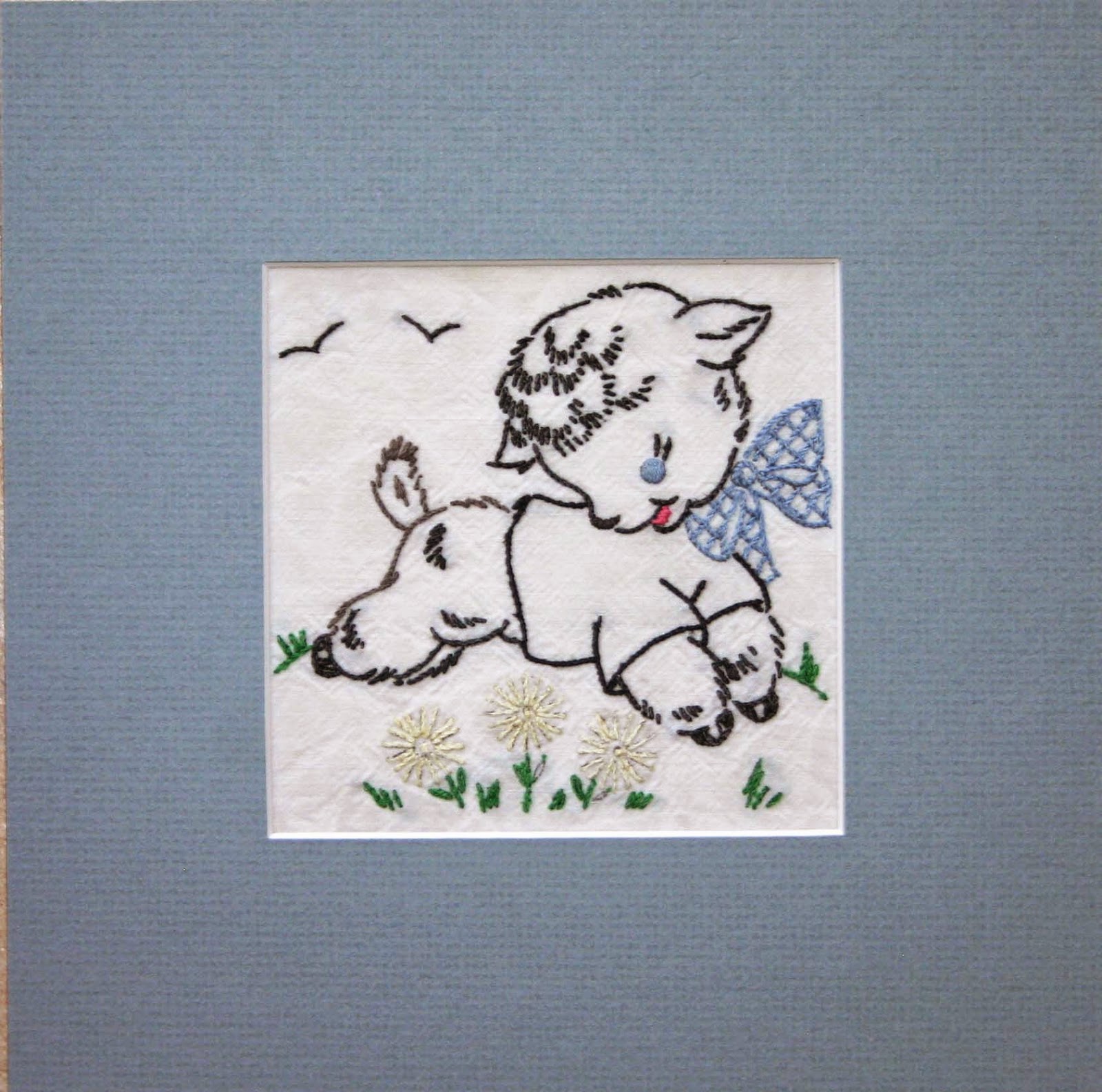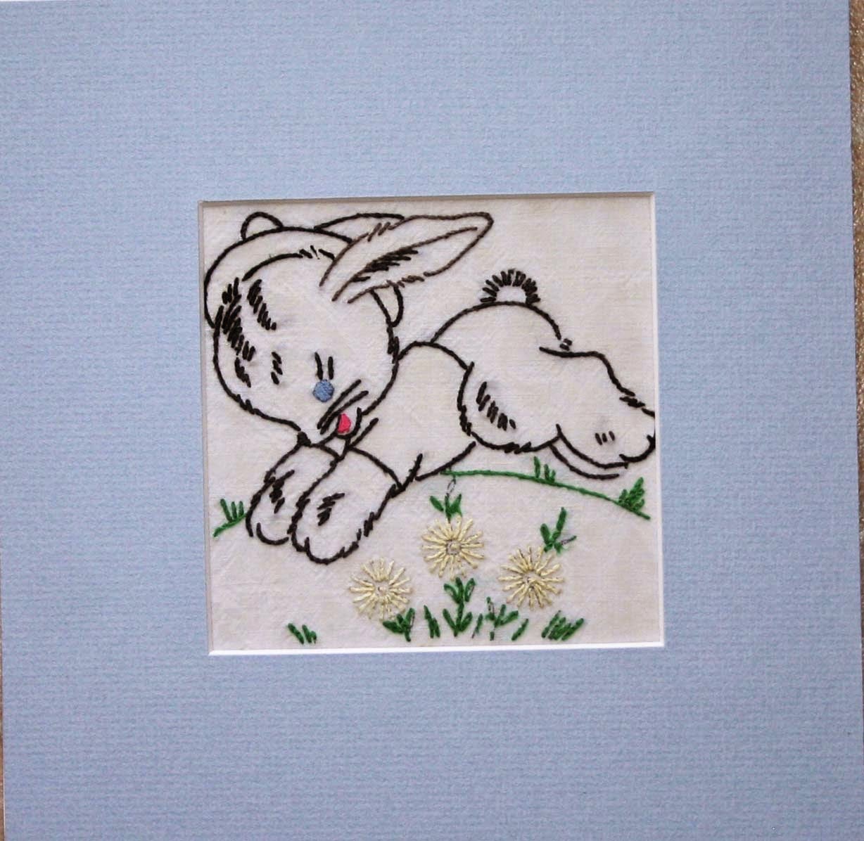 Embroidery on a pre-patterned feedsack. Note the ink from the sack of navy beans was indelible.