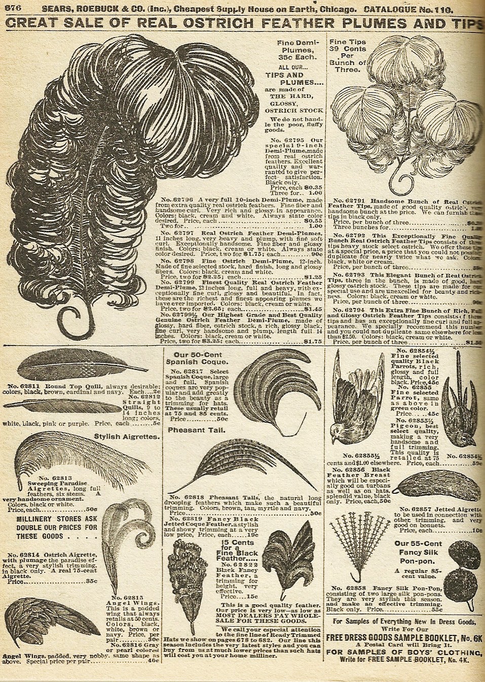Advertisement from Sears and Roebuck & Co. catalog, Fall, 1900 featuring assorted feathers and whole parrots, available in either black or green, also colored pigeons.  The price, a whopping 59 cents.