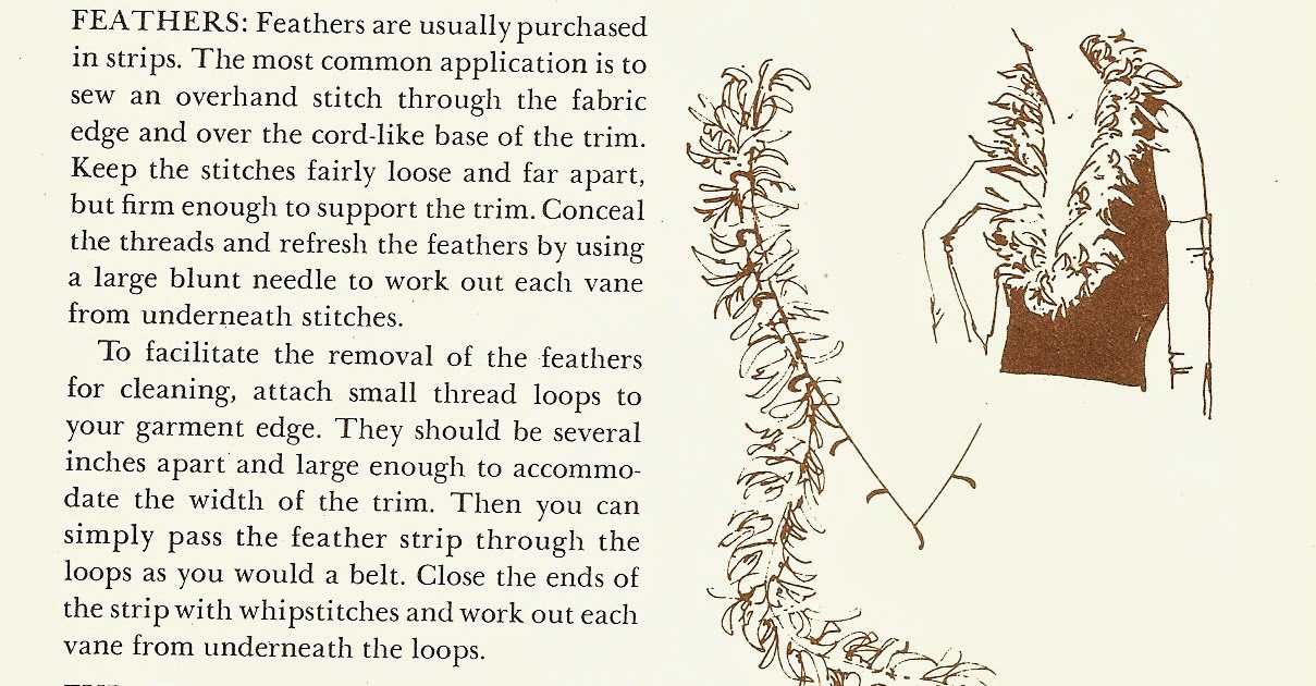 The Vogue Sewing Book, 1975, pg 392 describes the technique of attaching purchased strips of feathers.  They advocated “Don’t be skimpy-use rows and rows of them for a lavish effect”.