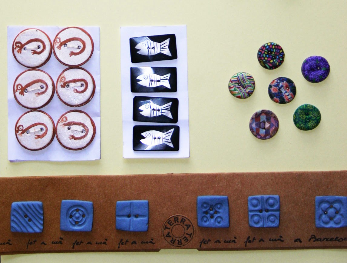 These handcrafted buttons are made of ceramic, clay and inlaid metal