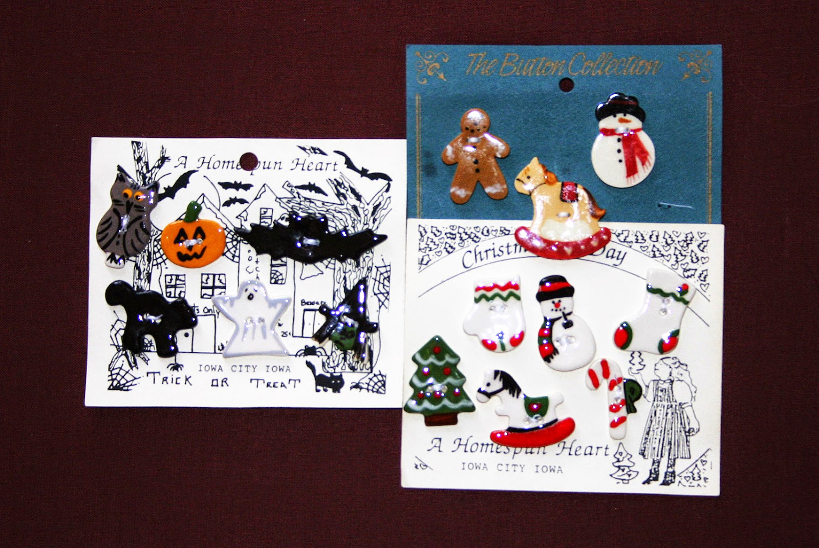 Holiday themed ceramic buttons from A Homespun Heart, Iowa City, Iowa and The Button collection, Mill Hill, Janesville, WI