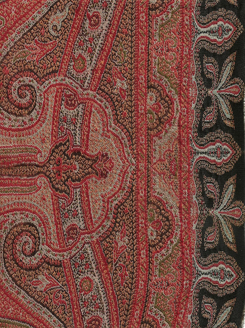 Woven paisley shawls may still be found, however, if they are in good condition they are pricey.  You may find these textiles in varying conditions and, depending upon the intended use, they may be repaired for table covers or sections may be salvaged for use as applique elements.  Printed paisley is more affordable.