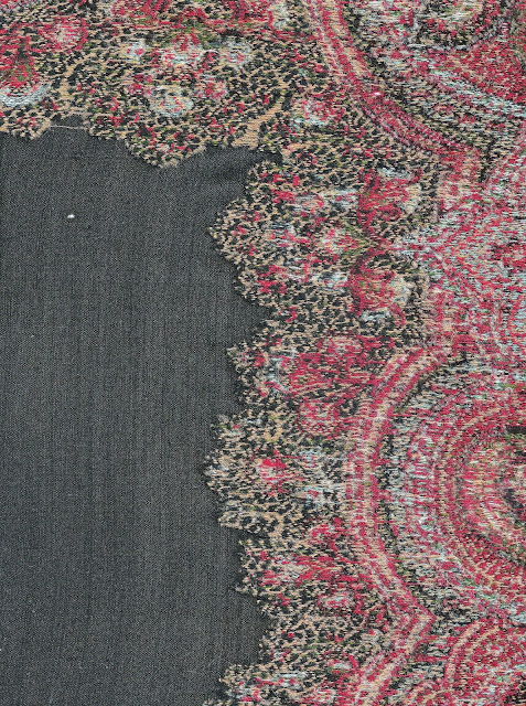 Section of a woven wool shawl.  Note the black background which formed a very large square in the center of the textile.