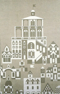 One of his designs was issued in collaboration with Jack Lenor Larsen (in fact this was the only Girard design Larsen produced).  Entitled “Palazzo”, this piece was unique in several ways.  It was a triptych of a European city featuring stylized buildings, bridges and archways.  Instead of using vibrant color, this piece, intended as a furnishing fabric, was screen-printed in white and shades of brown on a brown linen ground fabric.  The textile was given by Larsen, from his collection, to the Art Institute of Chicago and was featured in an exhibition