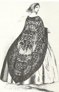 Chantilly lace is a bobbin lace from Chantilly, France and was a favorite of royalty. It was originally made of black silk , but also famous for white silk “blonde” Black lace was extremely popular during the ‘mourning period” of Queen Victoria and during the American Civil War..