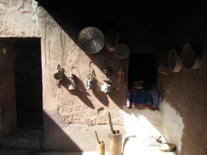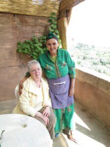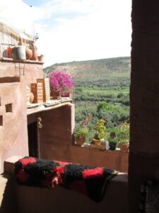 The lady of the house wore, for us, a traditional Berber costume,matching green pants and caftan, richly embroidered, and small green hat. Although no English was spoken, she graciously showed us her home and terraces , which held striking views.