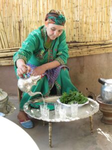 In Morocco, hot, freshly brewed mint tea is served to every guest. Made of green tea and mint it is quite refreshing and it is considered very rude to not partake of a small glass (even if it is your 3rd or 4th of the morning). The offering ranges from a full brewing ritual with many silver pots and kettles to brewed tea served in small glasses on a silver tray.