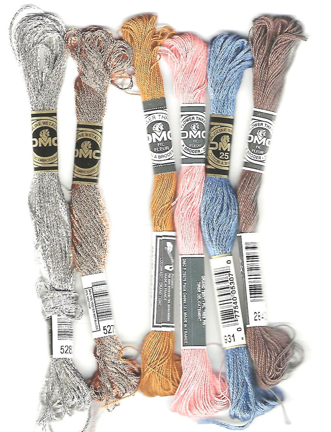 Manufactured threads include: Embroidery floss, six stranded cotton. *Twisted separable, shiny thread, suitable for surface stitchery, counted-, pulled-and drawn-thread work. Available in 454 colors.